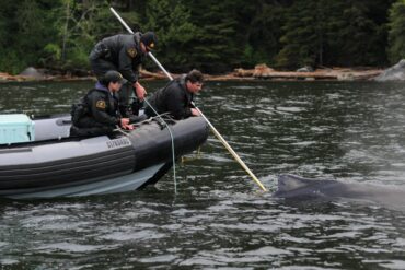 The VHF radio call comes early in the morning. “I’ve spotted a mother humpback with a young one who’s dragging...