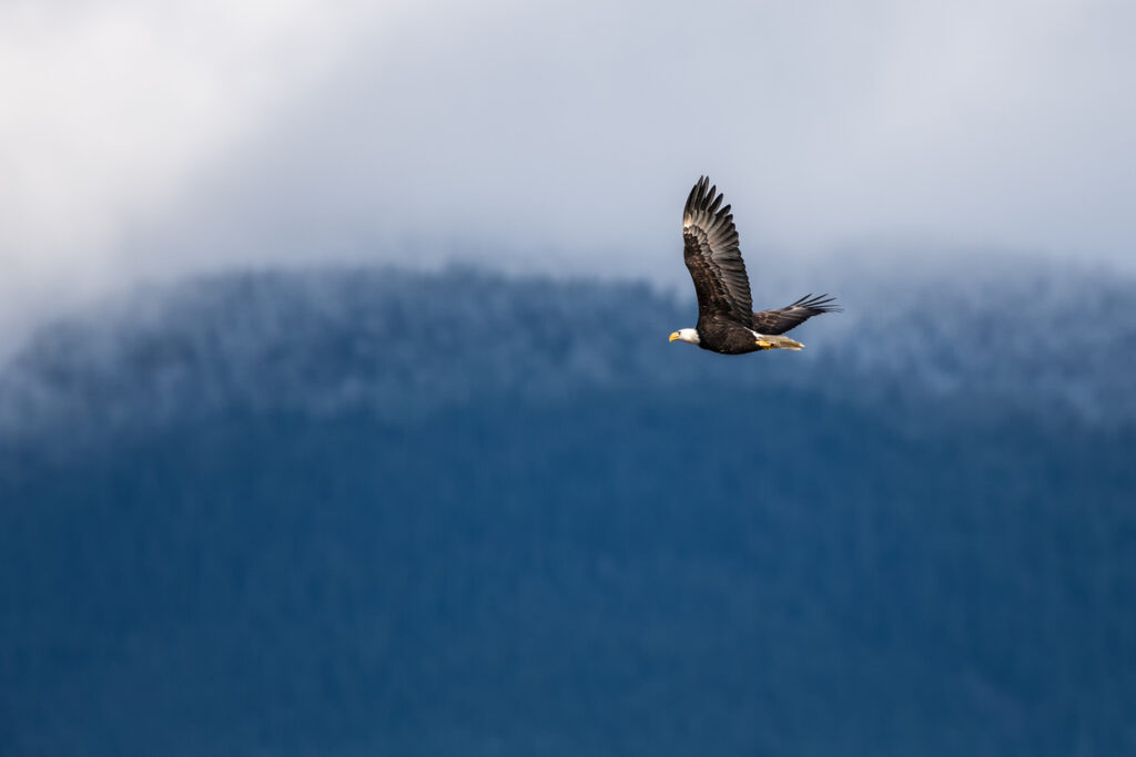 Near Squamish, the community of Brackendale hosts thousands of bald eagles each winter, drawn by salmon runs along the Squamish and Cheakamus rivers. Numbers typically peak between December and January, then gradually decline through February and March as birds disperse to breeding territories.
